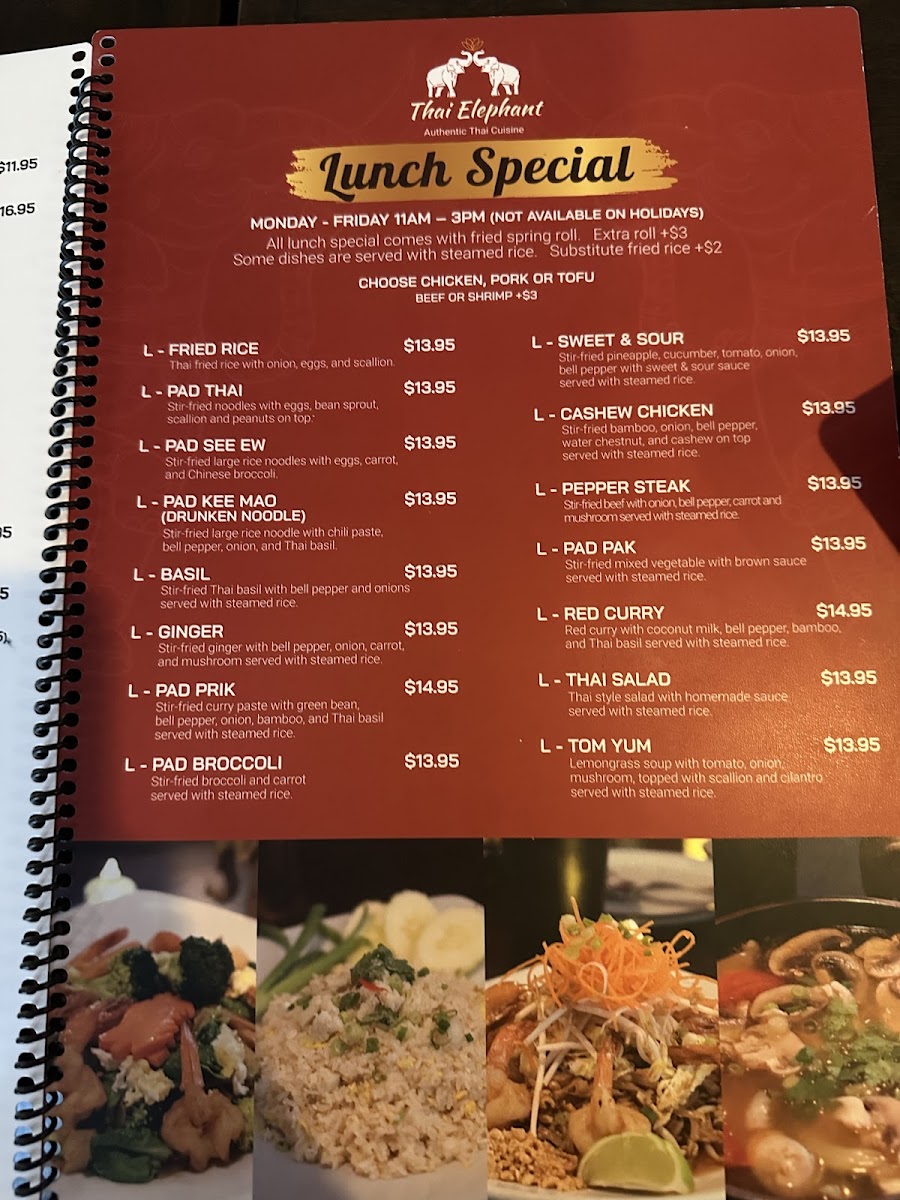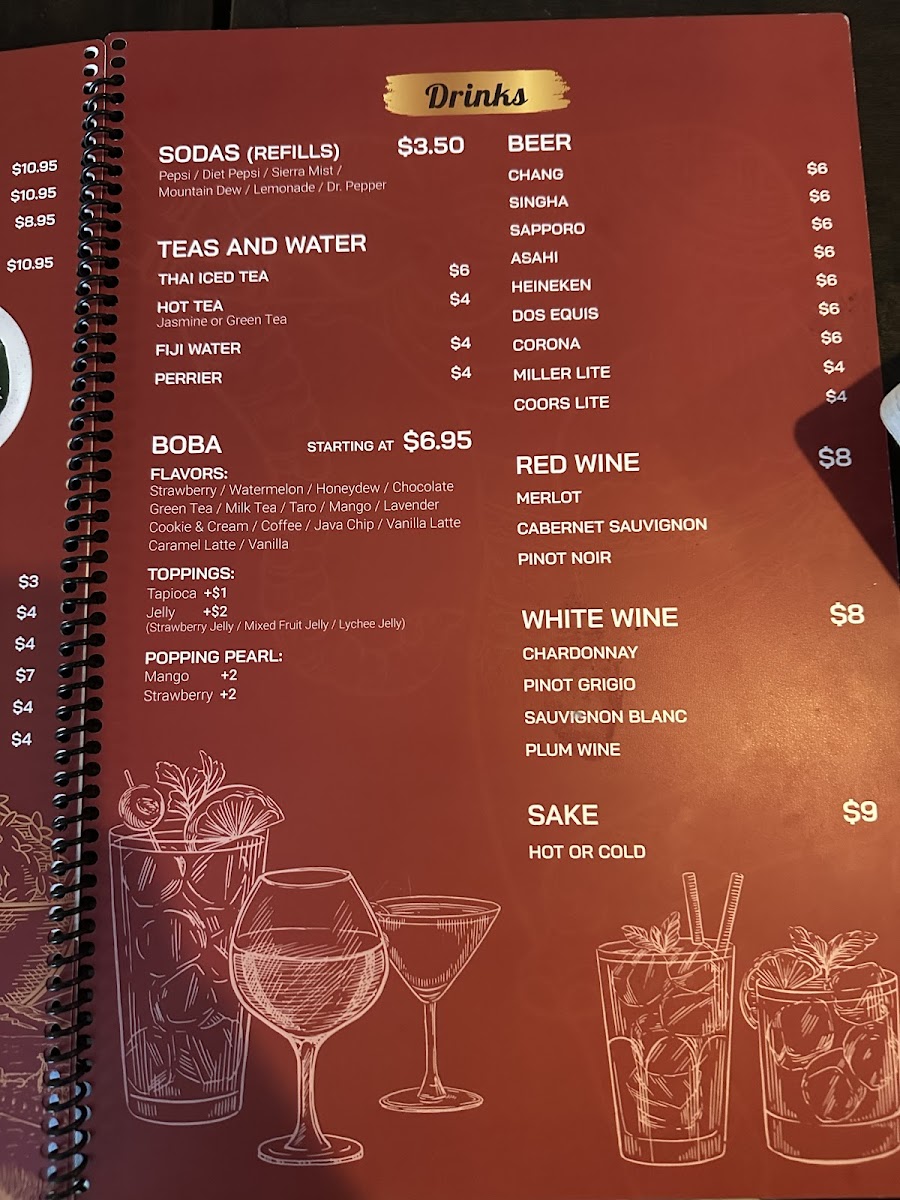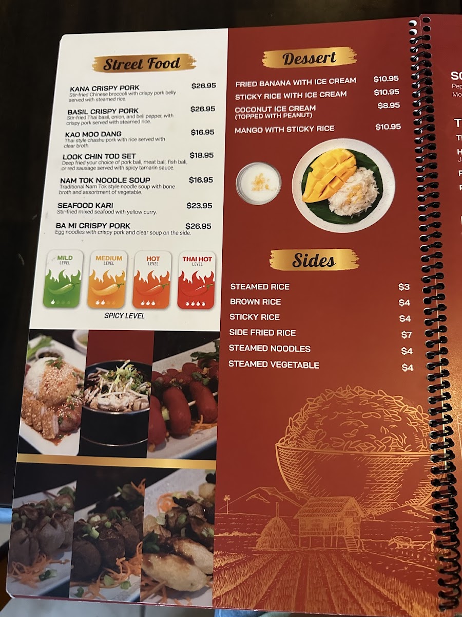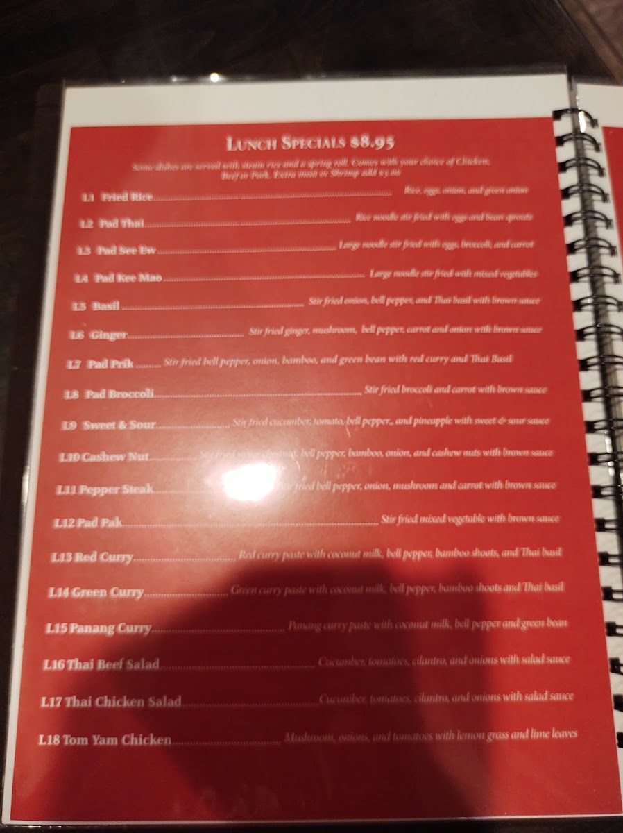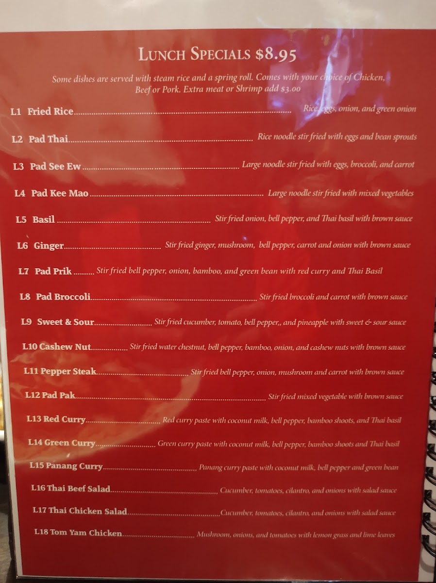Red curry with coconut milk, bamboo, bell pepper, and basil, served with rice. (Choice of Chicken, pork, or tofu) (Shrimp or Beef +3) (Seafood or Combination +5)