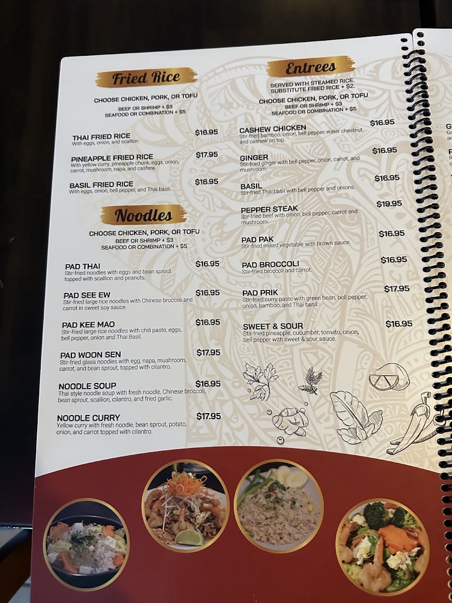 Fried rice with eggs, onion, bell pepper, and basil with (Choice of Chicken, pork, or tofu) (Shrimp or Beef +3) (Seafood or Combination +5)